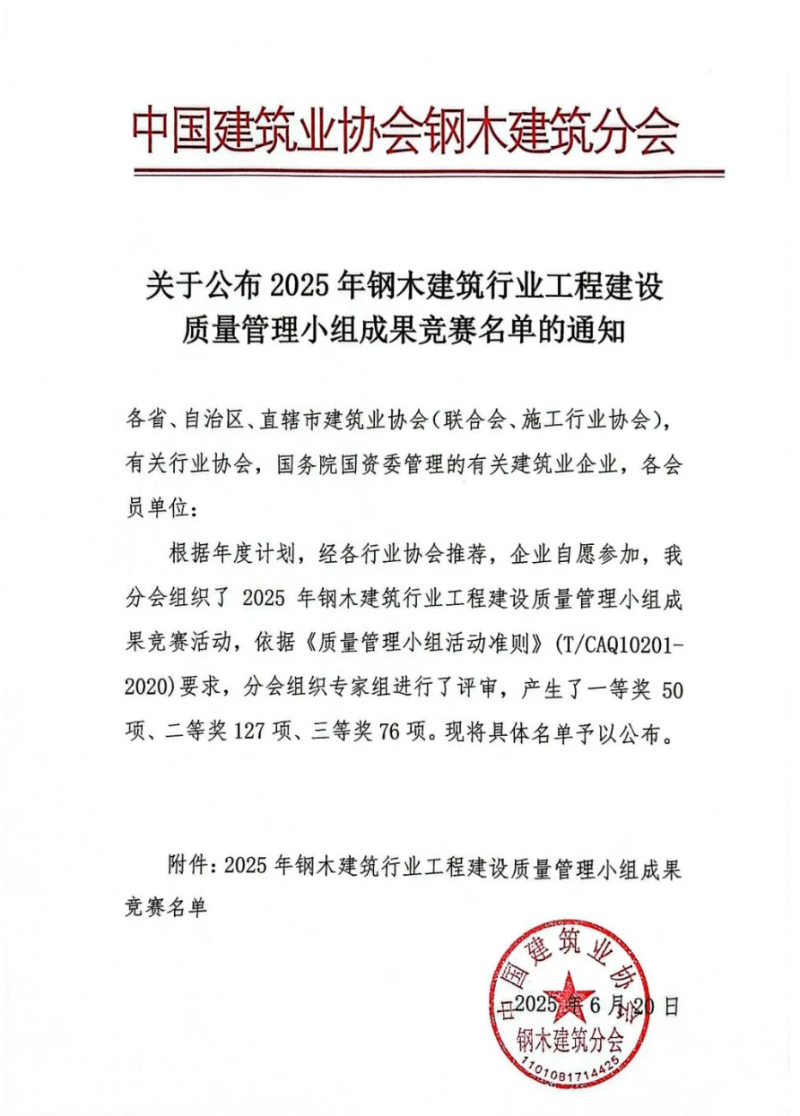 近日,在中國建筑業(yè)協(xié)會鋼木建筑分會主辦的2025年鋼木建筑行業(yè)工程建設質(zhì)量管理小組成果競賽中,中建材鋼構(gòu)公司憑借卓越的質(zhì)量管理成果和創(chuàng)新實踐,一舉斬獲多項榮譽,充分彰顯了其在行業(yè)內(nèi)的領先地位和綜合實力。